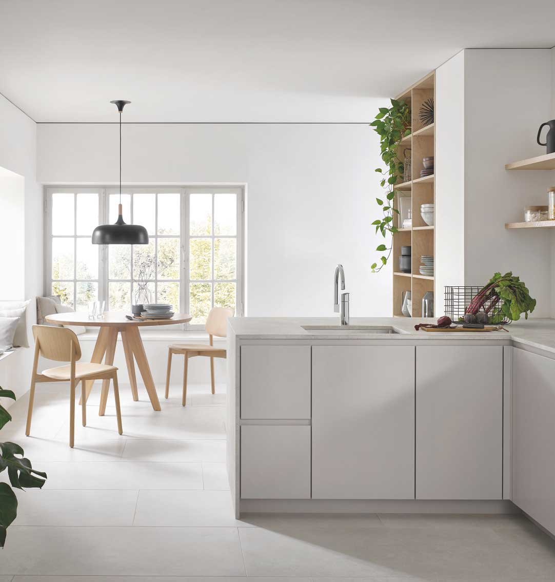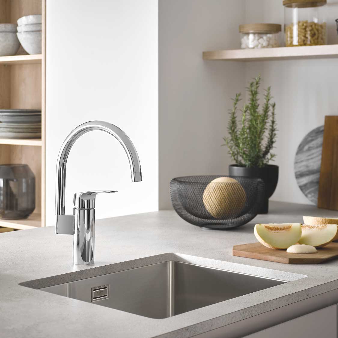 Grohe Eurosmart je klasika v oblikovanju kuhinje, zdaj osvežena in posodobljena s tankim sodobnim profilom in 35% višjim izlivom za večje udobje uporabnika. Visok C-izliv, ki se vrti za 150°, kar je kot nalašč za ustvarjanje prilagodljivega delovnega okolja.