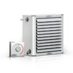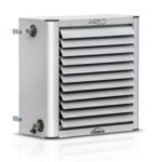 Industrijski grelnik zraka; možna montaža na steno ali strop, horizontalni in vertikalni pretok zraka, stranski priključek vode.