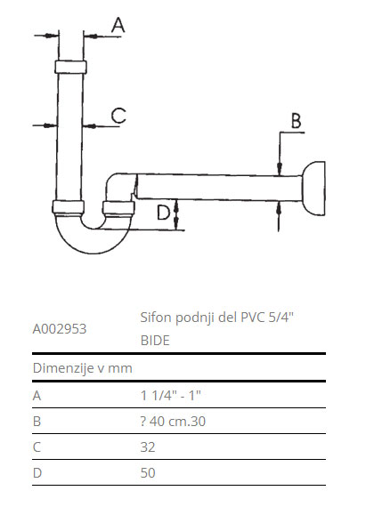 Sifon za bide, spodnji del, PVC, 5/4″.