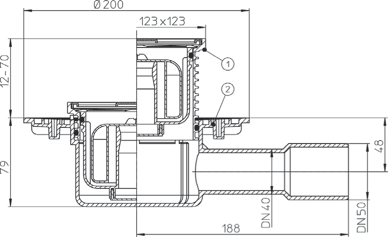 Horizontalni talni odtok DN40/50 s tesnilno prirobnico, smradno zaporo PRIMUS (deluje brez vode), skrajšljivim okvirnim nastavkom 14-77 mm/147×147 mm in nerjavečo jekleno rešetko. Vgradna zaščita je zajeta z dobavo.
