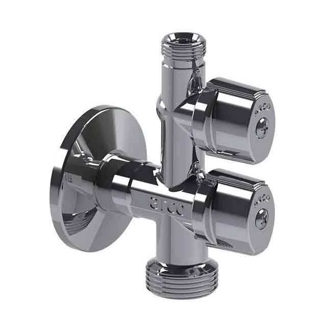 COMBI kotni ventil z nepovratnim ventilom združuje dva neodvisna ventila v enem komadu. Oba iztoka se neodvisno odpirata z obratom 1/4 in s tem omogoča uporabo za priklop na pralni stroj, drugi del pa za priklop na napeljavo hladne vode.